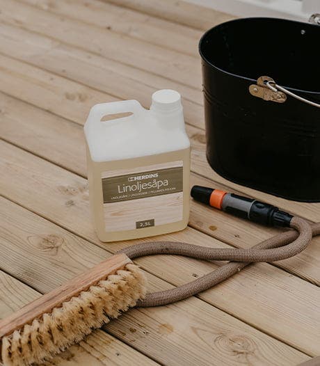 Exempel (Herdins): dosera ca 5–8 dl linoljesåpa till 10 liter kallt vatten och skura i träets längdriktning.